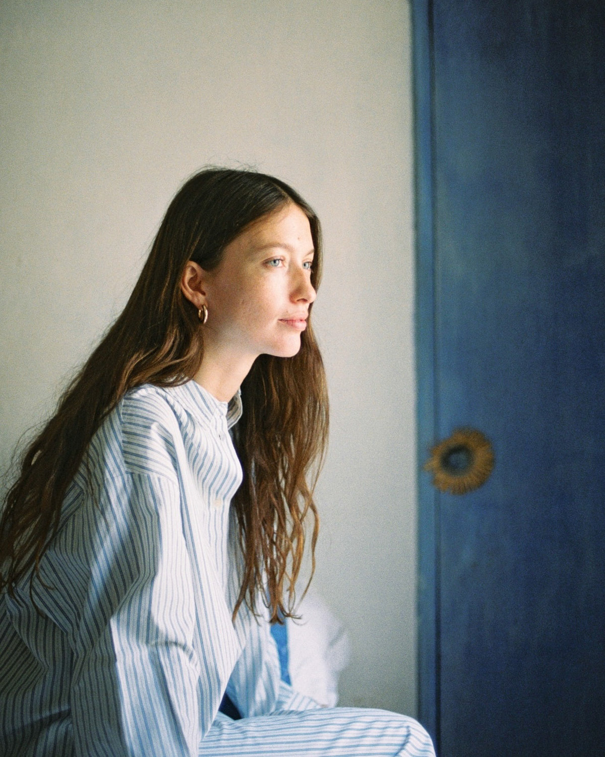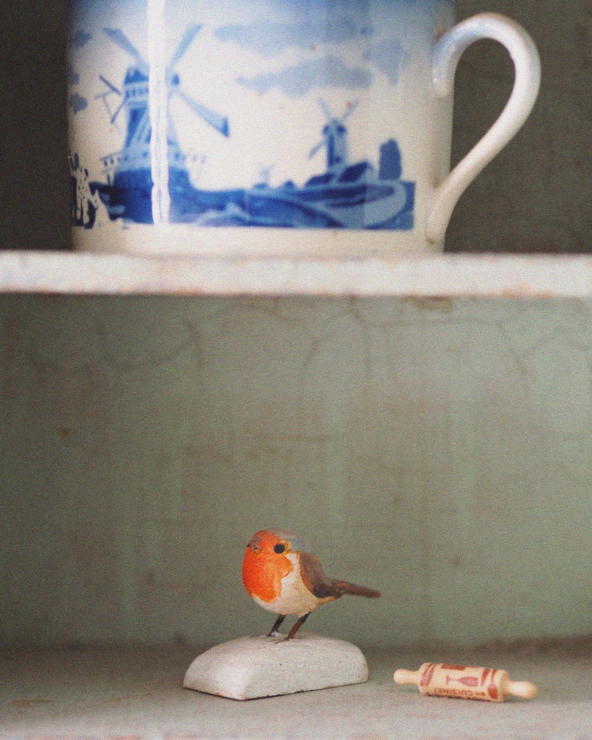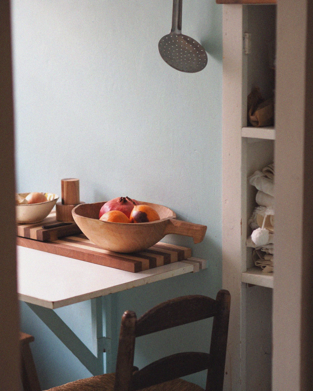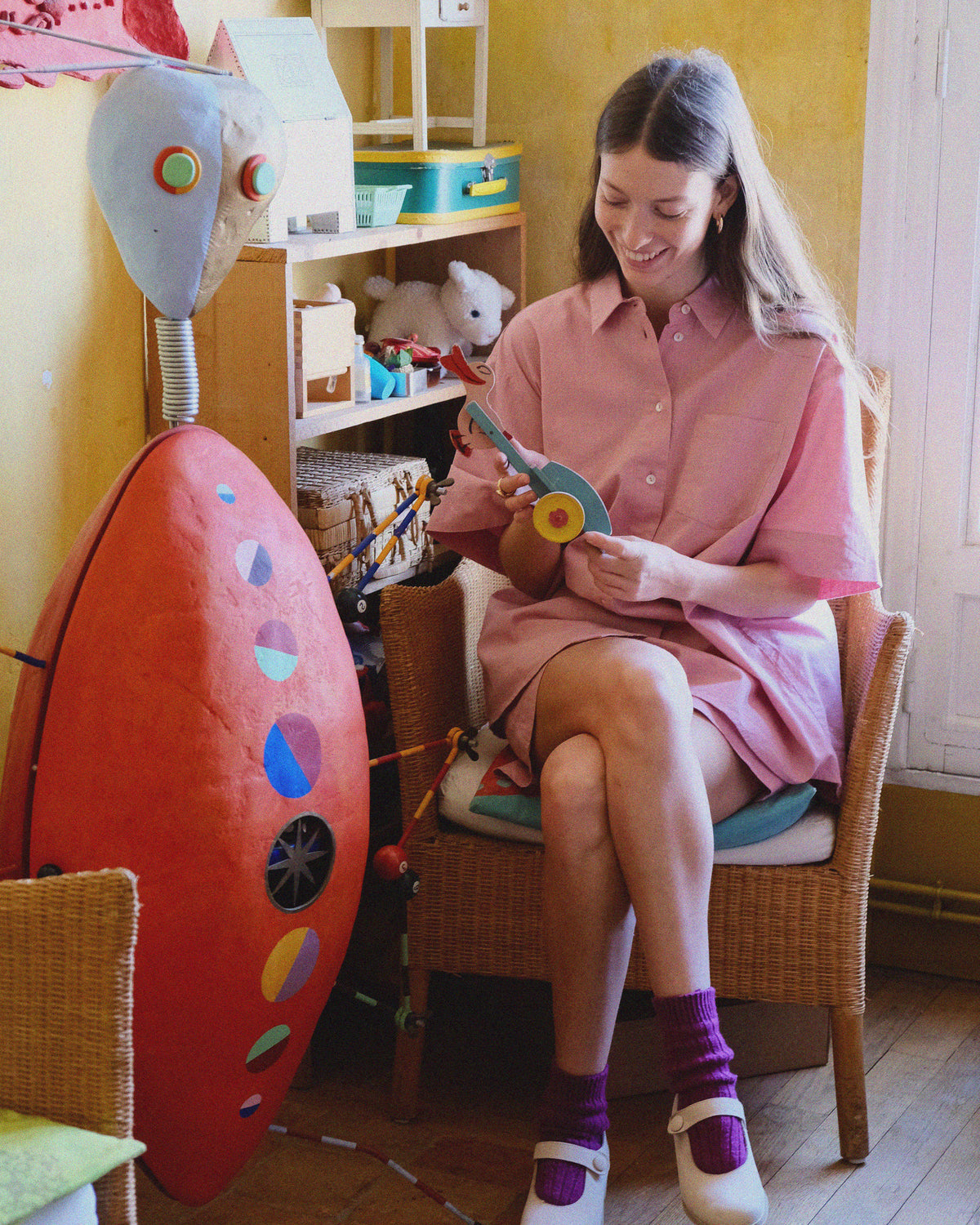 „Ich habe so viele magische Erinnerungen aus meiner Kindheit. Zum Beispiel dieses kleine Kabinett. Es ist ein Roboter aus Pappmaché mit einer Tür in der Mitte des Bauches. Die gestrickten Kinderhüte aus meiner Kindheit sind noch darin. Schau.“ Die kleine Tür im Kabinett offenbart die schönsten gestrickten Mützen in verschiedenen Formen und Farben. „Meine Eltern haben es für ein Shooting für Marie Claire gemacht, und danach fanden sie, dass wir es auch für etwas nutzen sollten – also kam es hier hinein.“